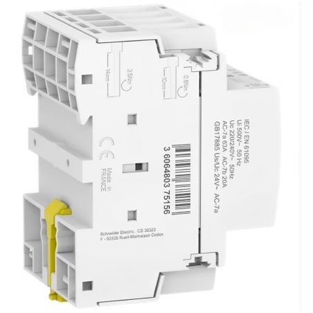 Le contacteur modulaire A9C20864 occupe 3 modules de 18mm sur le rail DIN du tableau de votre installation électrique.
