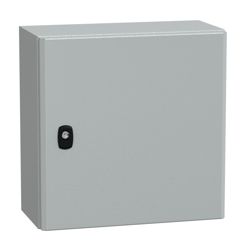Ce coffret métallique étanche est issu de la gamme Spacial S3D. Il est livré avec avec une plaque passe-câbles à percer pour y intégrer des presses étoupes. Il est également possible d’installer une plaque passe-câbles avec entrée souple sans perçage disponible en accessoire